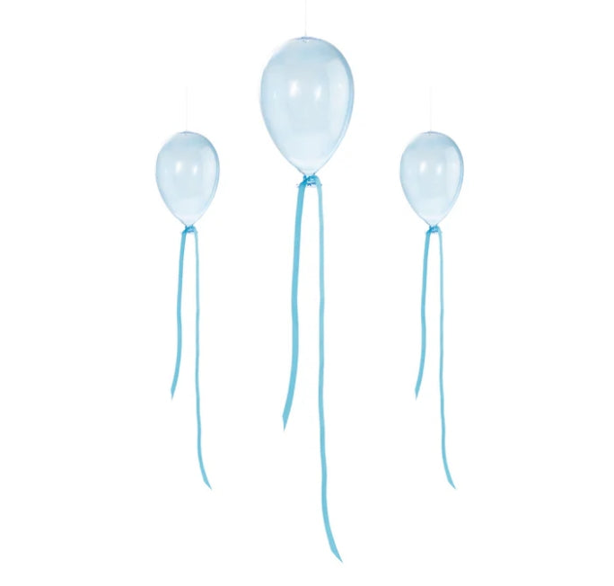 The Aria in Acqua glass balloon collection unites timeless aqua blue balloons to form the acqua colorway. Made from substantial transparent colored glass for ethereal light filtration. This glass balloon set includes one large aqua blue and two medium aqua blue balloons, with individually coordinated ribbons. Clear connected line (included) allows for simple, sleek, and luxurious display. Each balloon arrives in a custom storage box with magnetic closure. Traditional retail is $325.