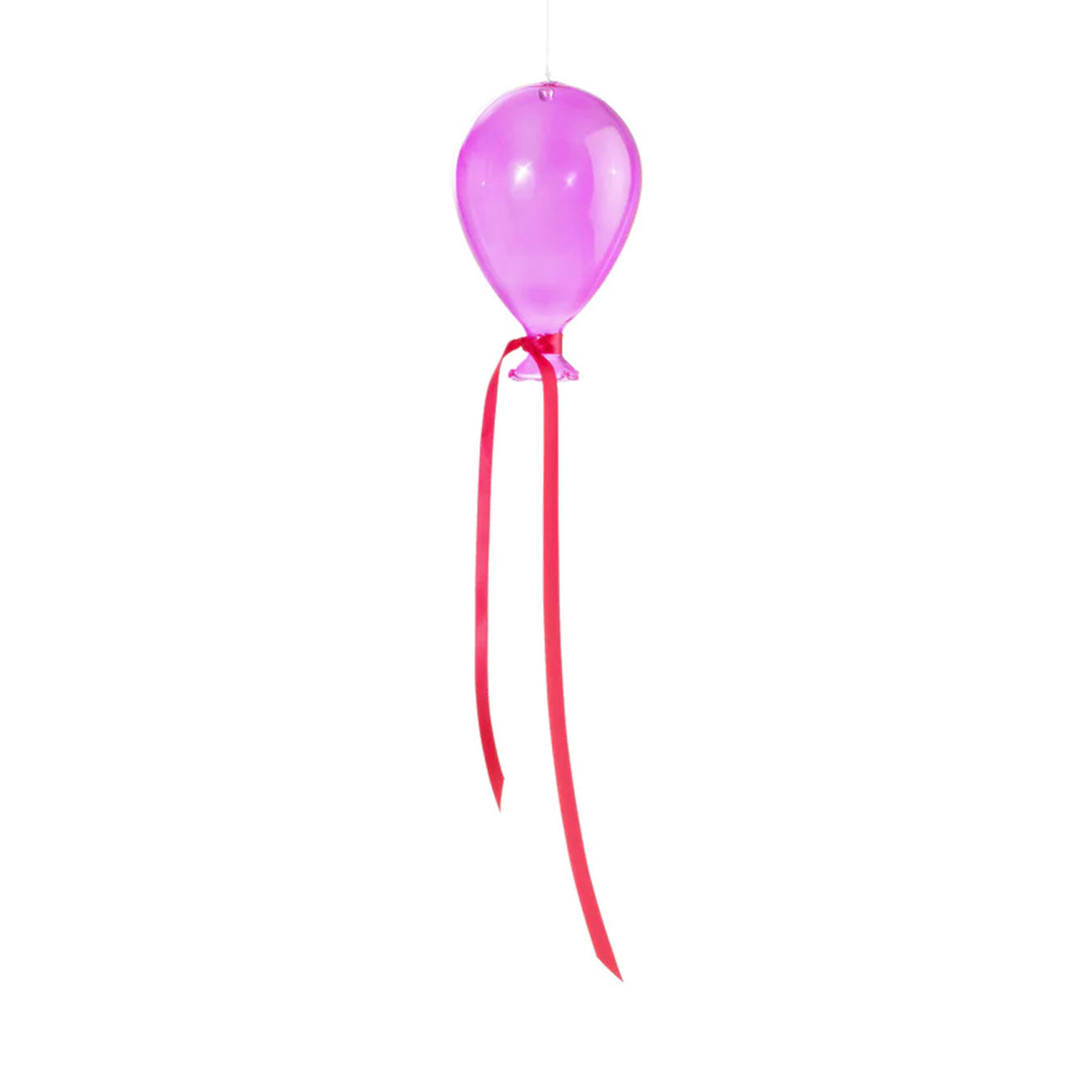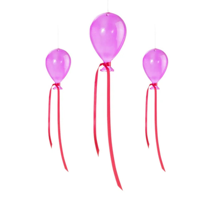 The Aria in Rosa glass balloon collection unites timeless pink balloons to form the Rosa colorway. Made from substantial transparent colored glass for ethereal light filtration. This glass balloon set includes one large pink and two medium pink balloons, with individually coordinated ribbons. Clear connected line (included) allows for simple, sleek, and luxurious display. Each balloon arrives in a custom storage box with magnetic closure. Traditional retail is $325.
